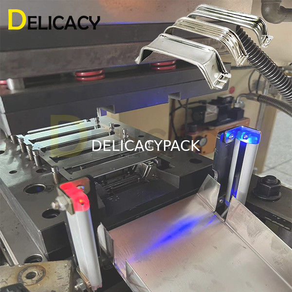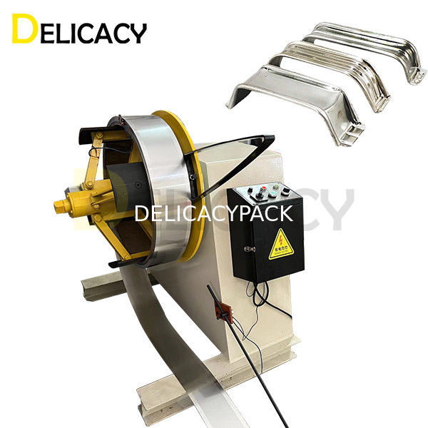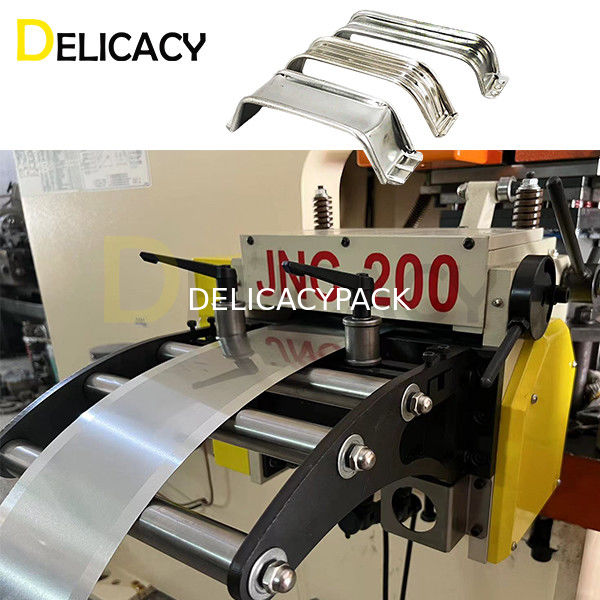 Der Prozess beginnt normalerweise mit einer Rohmaterialrolle, die einer Maschine zugeführt wird, die das Material in eine Griffform bringt.Anschließend werden die Griffrohlinge auf die entsprechende Größe zugeschnitten und zur nächsten Maschine transportiert, wo sie gebogen und geformt werden, damit sie auf den Deckel einer rechteckigen 4-Liter-Dose passen.